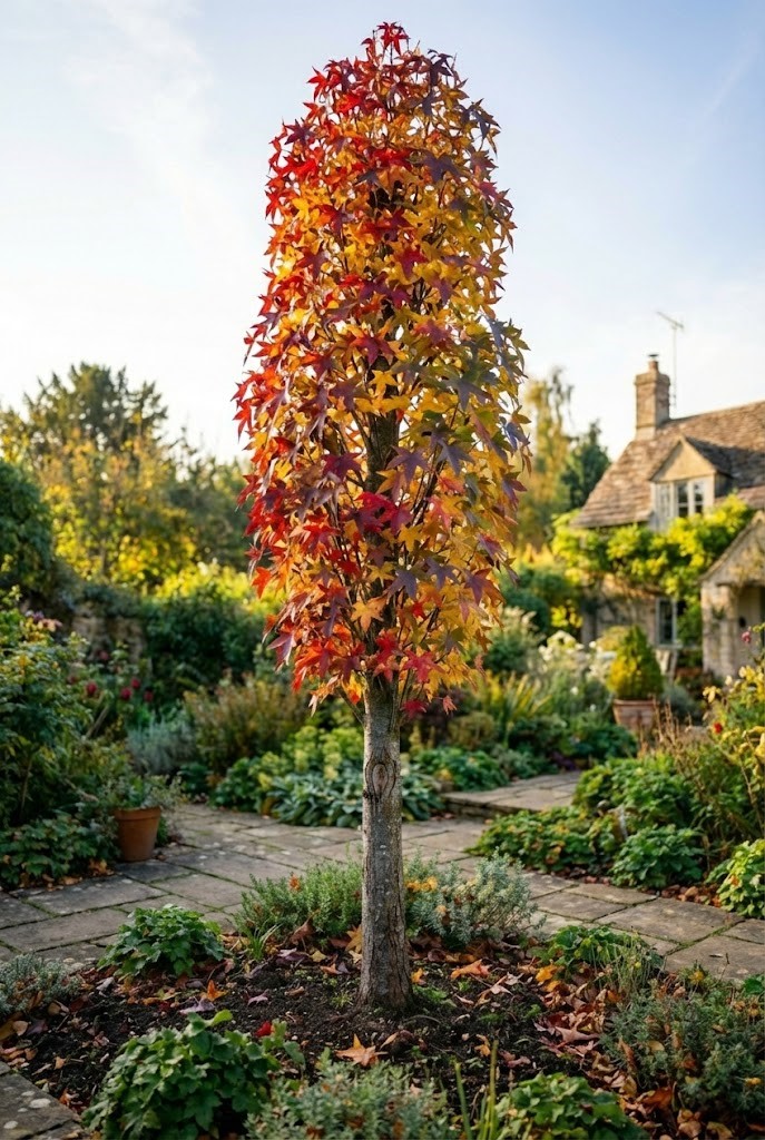 Ambrowiec 'Slender Silhouette' to unikatowa, szczepiona odmiana o najbardziej kolumnowym pokroju na świecie, która staje się architektonicznym sercem nowoczesnych założeń, będąc symbolem elegancji i pionowej perfekcji. Jego liście, o głębokim wcięciu i gwiazdkowatym kształcie, wyróżniają się na tle innych drzew niespotykaną zmiennością barw, od soczystej zieleni po jaskrawą purpurę. Jest to drzewo niezwykle wytrzymałe i zajmujące minimalną przestrzeń, co czyni je doskonałym wyborem zarówno do wąskich ogrodów miejskich, jak i dla kolekcjonerów dendrologicznych rarytasów. Wybierając odmianę Slender, zapraszasz do swojego ogrodu żywą rzeźbę i gwarancję spektakularnych, ognistych widoków dla całej rodziny.