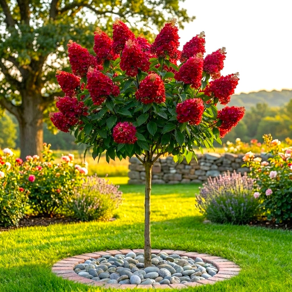 Hortensja Czerwona prowadzona na pniu rośnie umiarkowanie silnie, tworząc kształtną, kulistą koronę, która z czasem pięknie się zagęszcza. Kwiatostany są bardzo duże, stożkowate, o lśniącej, początkowo seledynowej barwie, która szybko przechodzi w czystą biel, by w pełnym słońcu nabrać swojej legendarnej, głębokiej czerwieni. Pod ciężarem kwiatów mocne pędy utrzymują zwartą formę, co sprawia, że korona wygląda niezwykle okazale. Kwiaty są idealne do podziwiania prosto z tarasu oraz jako trwały element suchych bukietów. Dojrzałość dekoracyjną osiągają zazwyczaj w drugiej połowie lata.