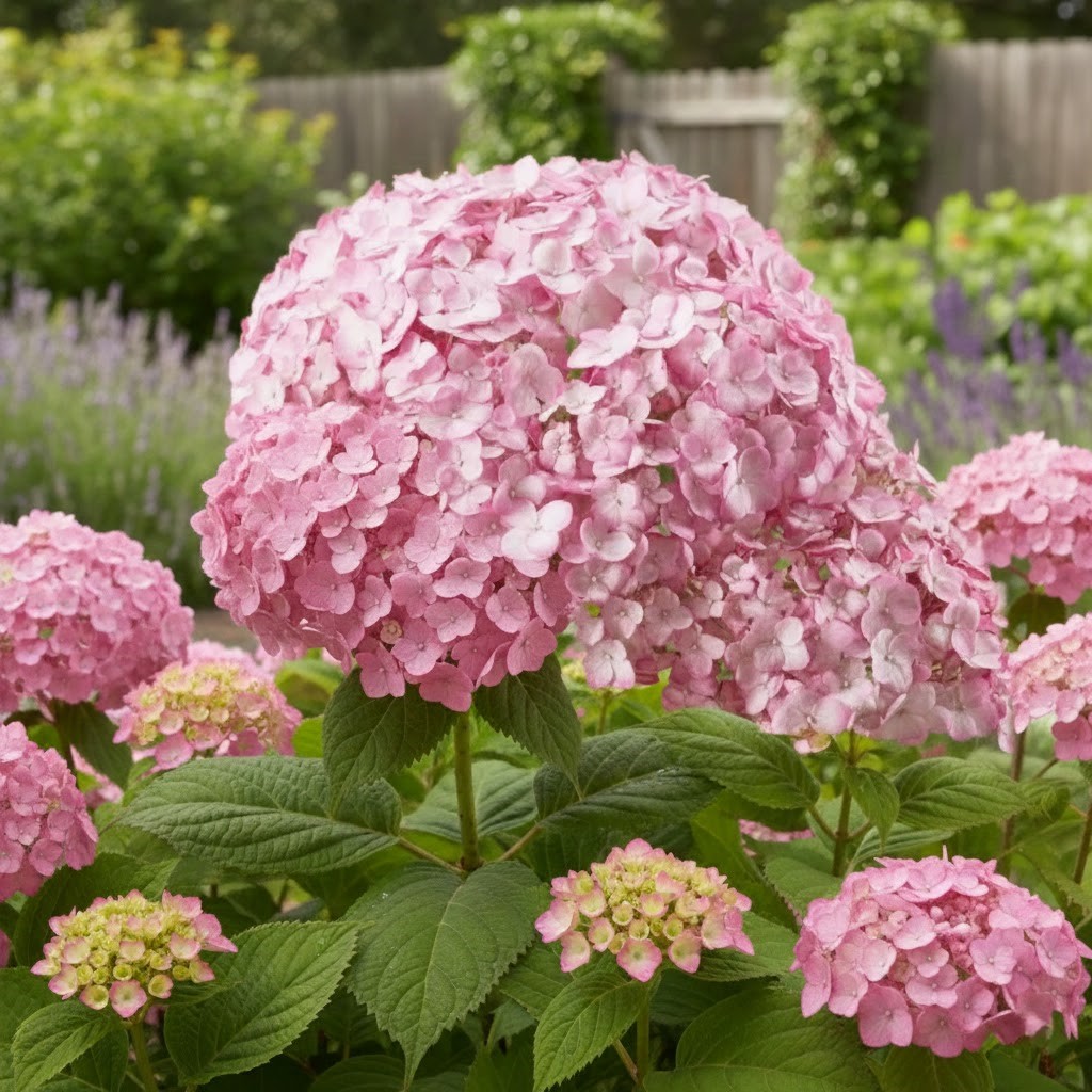 Hortensja 'Bubblegum' to krzew o zwartym, kompaktowym pokroju, osiągający zazwyczaj około 80–100 cm wysokości i podobną szerokość. Jej kwiatostany są prawdziwym rarytasem – gigantyczne, półkuliste baldachy wypełnione po brzegi setkami drobnych kwiatów w odcieniu delikatnego różu. W przeciwieństwie do starszych odmian, 'Bubblegum' charakteryzuje się znacznie sztywniejszymi pędami, które dzielnie utrzymują ciężar kwiatów. Roślina ta, dzięki swojej gęstej formie i ciemnozielonym liściom, stanowi doskonałe tło dla innych bylin, a w pełni kwitnienia staje się główną gwiazdą ogrodu aż do wczesnej jesieni.