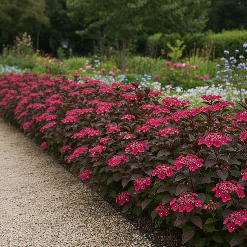 Pierwszych, wiśniowych kwiatów możesz spodziewać się bardzo szybko po posadzeniu. Hortensja ta kwitnie obficie i corocznie, tworząc na szczytach pędów liczne koronkowe talerze kwiatów. Aby zachować ich intensywną barwę, warto dbać o odpowiednie stanowisko. Po przekwitnięciu kwiatostany pozostają dekoracyjne jeszcze przez długi czas, zdobiąc ogród aż do późnej jesieni. Jest to doskonała odmiana dla kolekcjonerów, która dzięki ciemnym liściom wyróżnia się na tle każdej innej rośliny w ogrodzie.