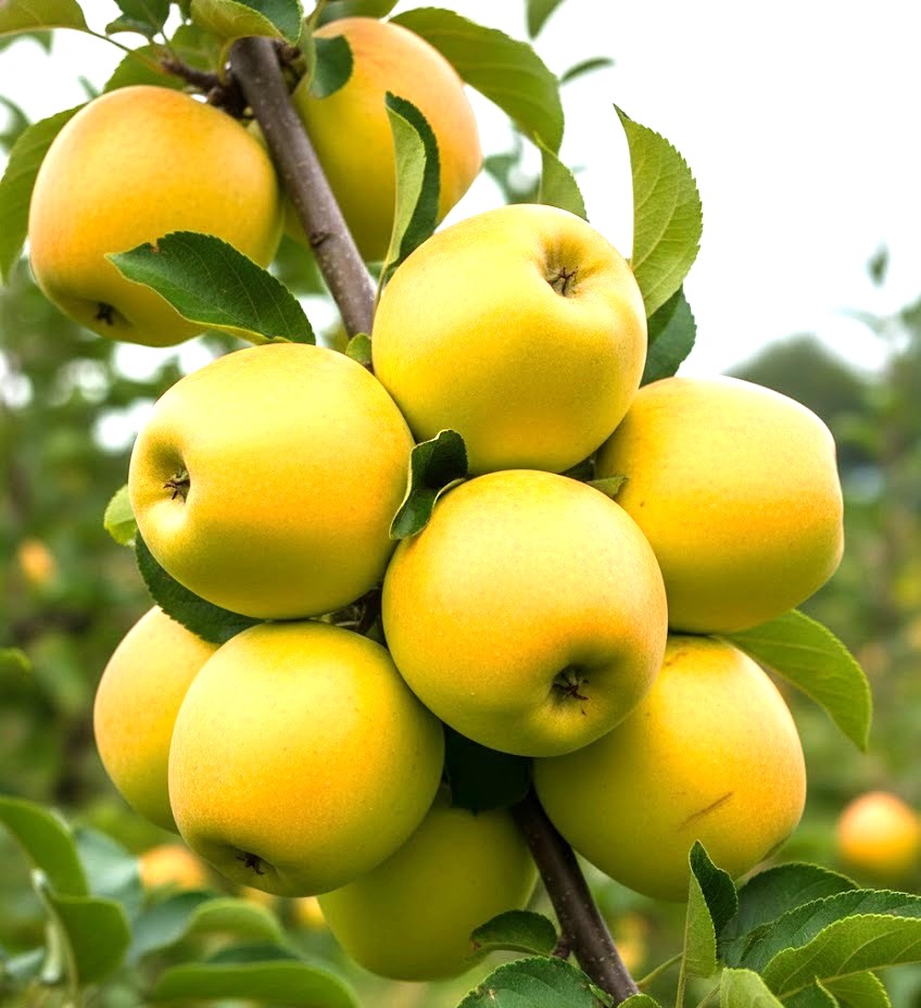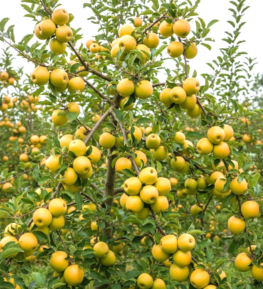 ✅ Piękny Element Ogrodu: Złociste jabłka pięknie prezentują się na tle zielonych liści, stanowiąc ozdobę jesiennego ogrodu.