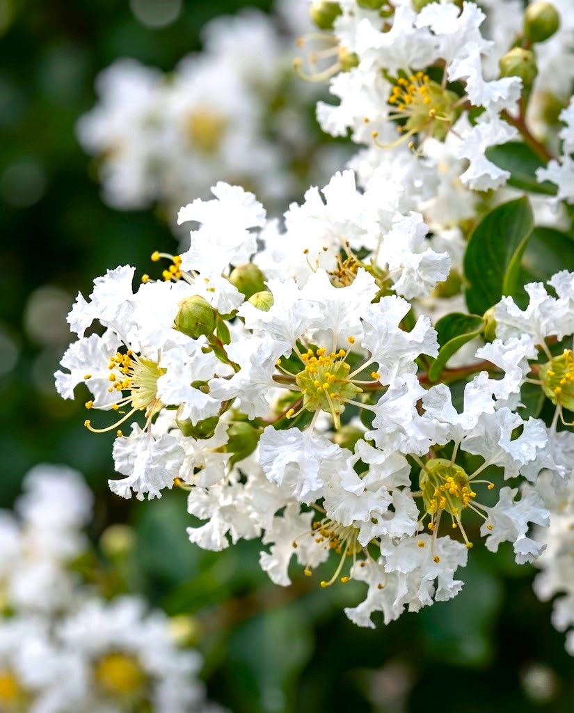 Lagerstroemia biała prowadzona na pniu rośnie umiarkowanie silnie, tworząc kształtną, kulistą koronę, która z czasem pięknie się zagęszcza. Kwiatostany są okazałe, wiechowate, o lśniącej, śnieżnobiałej barwie, która w pełnym słońcu lśni niczym prawdziwe perły. Pod delikatnymi, pofałdowanymi płatkami kryje się ich szlachetna struktura, która sprawia, że kwiaty wyglądają na wyjątkowo puszyste i trwałe. Są one idealne do podziwiania prosto z tarasu oraz jako elegancki akcent w reprezentacyjnych częściach ogrodu. Pełnię kwitnienia osiągają zazwyczaj od lipca aż do września.
