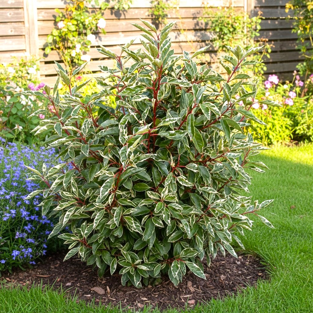 Laurowiśnia iberyjska Variegata rośnie umiarkowanie silnie, tworząc gęsty, zwarty krzew o eleganckim, wzniesionym pokroju, który z czasem pięknie się rozrasta. Liście są jej największym atutem – wąskie, lancetowate, o ciemnozielonym środku i nieregularnym, śnieżnobiałym obrzeżeniu. Co ważne, młode przyrosty i pędy mają kontrastową, ciemnoczerwoną barwę, co w połączeniu z pstrym ulistnieniem daje niesamowity efekt wizualny. Doskonale nadaje się do formowania, a swoją najbardziej nasyconą barwę prezentuje przez 12 miesięcy w roku, nie zrzucając liści na zimę.