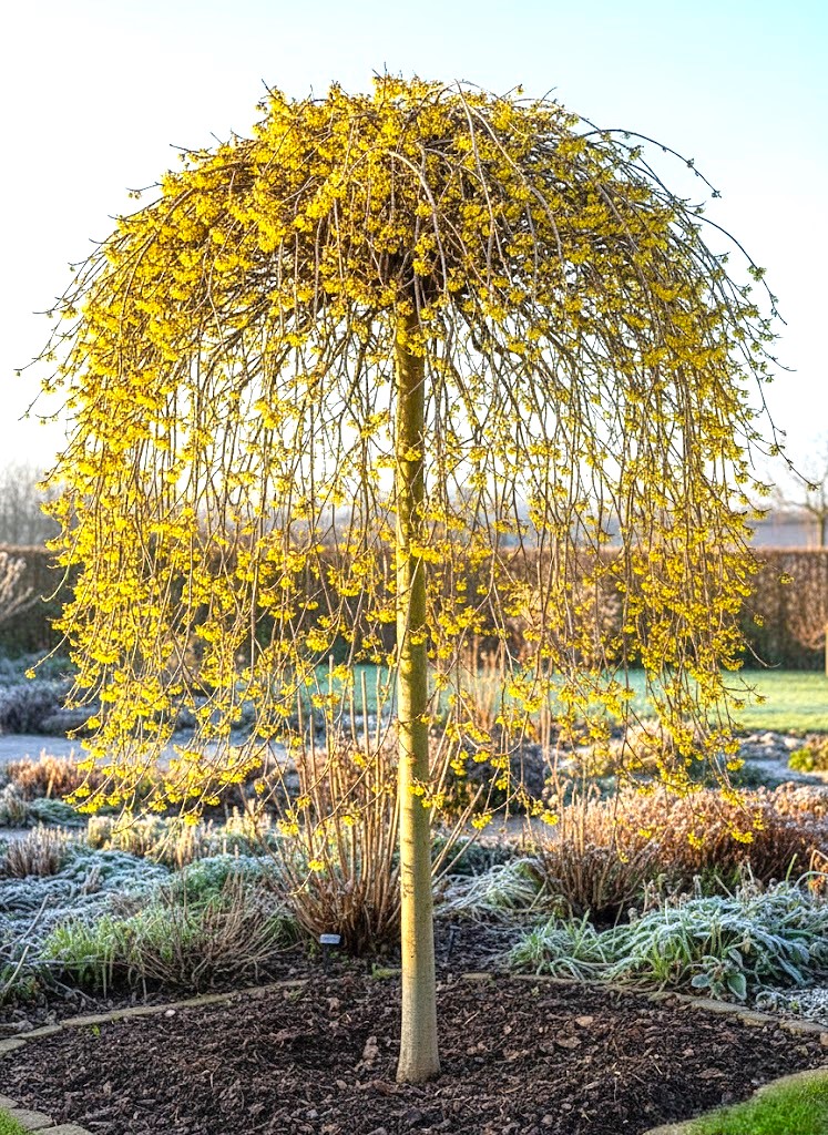 Oczar wirginijski prowadzony na pniu tworzy niezwykle malowniczą koronę. Dzięki giętkim i plastycznym gałązkom, jego naturalny pokrój ma tendencję do lekkiego przewieszania się ku dołowi, co nadaje roślinie romantyczny, niemal płaczący wygląd. Dla miłośników porządku mamy jednak świetną wiadomość – roślina ta doskonale poddaje się cięciu, co pozwala na prowadzenie jej w formie bardziej zwartej, regularnej kuli. Kwiaty są zjawiskowe: mają postać wąskich, poskręcanych tasiemek o cytrynowym odcieniu, które gęsto oblepiają bezlistne pędy. Dodatkowym atutem są liście, które jesienią przebarwiają się na oszałamiający, świetlisty żółty kolor.