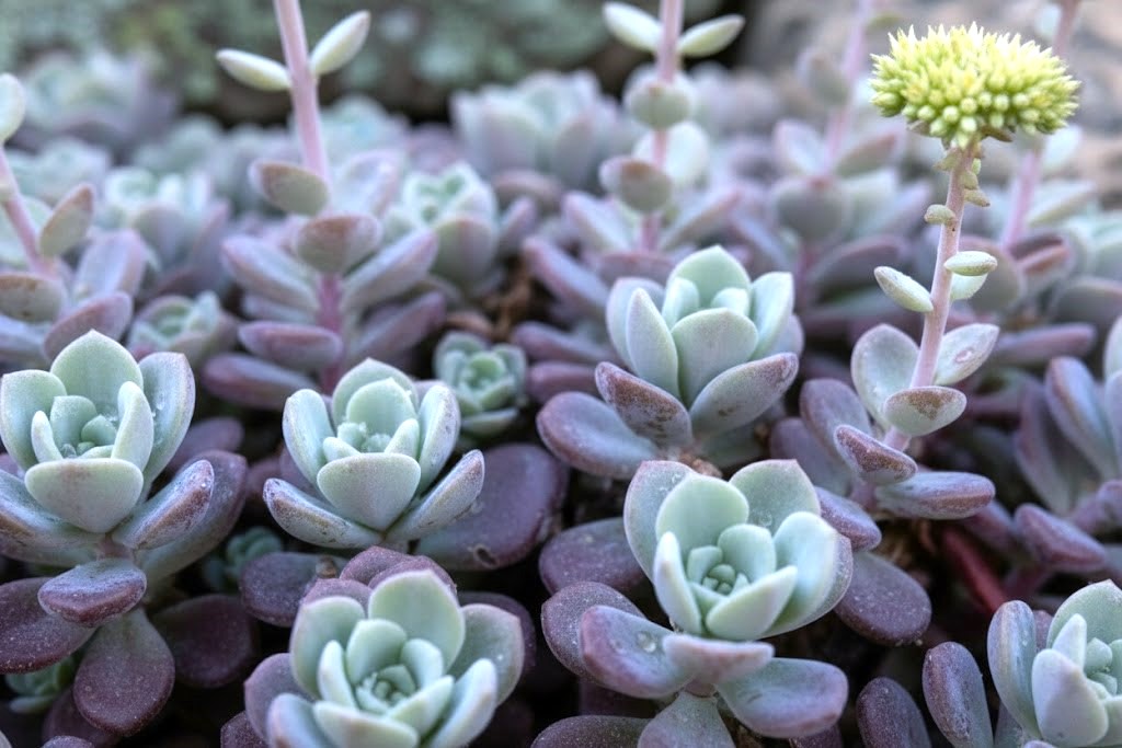 Rozchodnik Purpureum rośnie umiarkowanie silnie, tworząc zwarte, niskie kobierce złożone z geometrycznych rozet, które z czasem pięknie się zagęszczają. Liście są łopatkowate, pokryte lśniącym, woskowym nalotem o barwie głębokiej purpury, która w pełnym słońcu nabiera intensywnego, niemal metalicznego blasku. Pod tą barwną powłoką kryje się soczyste wnętrze typowe dla sukulentów. Rośliny są idealne do obsadzania szczelin między kamieniami, murków oraz jako ozdoba suchych rabat. Dojrzałość dekoracyjną i pełnię wybarwienia utrzymują przez cały rok.