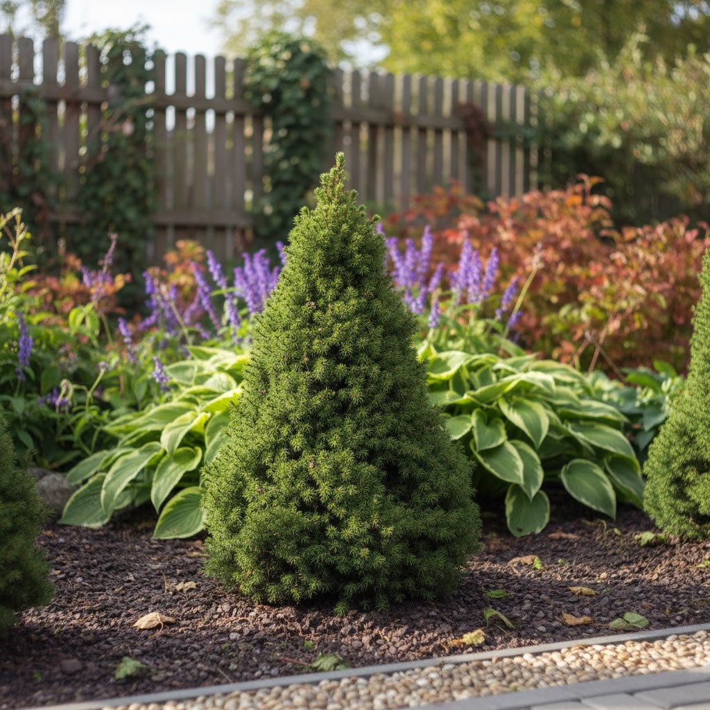 Świerki białe najlepiej czują się na glebach przepuszczalnych, żyznych i umiarkowanie wilgotnych. Conica uwielbia stanowiska słoneczne i lekko osłonięte – słońce jest kluczowe, aby korona była gęsta i równomiernie wybarwiona z każdej strony. Młode sadzonki warto regularnie podlewać, szczególnie w okresach letnich upałów oraz późną jesienią przed zamarznięciem gleby. Zalecane pH gleby powinno być lekko kwaśne. Odpowiednie ściółkowanie korą zapewni drzewku idealny start, utrzyma wilgoć w korzeniach i zapobiegnie wyrastaniu chwastów.
