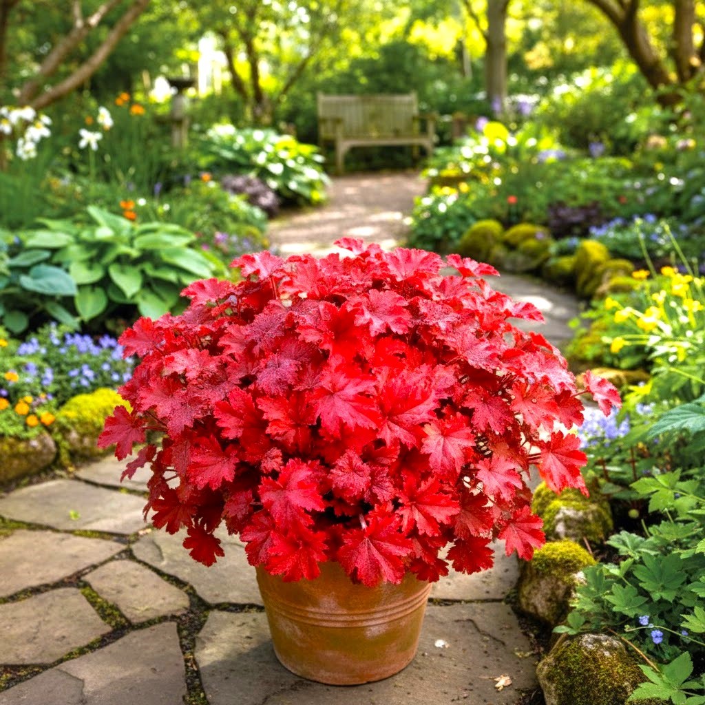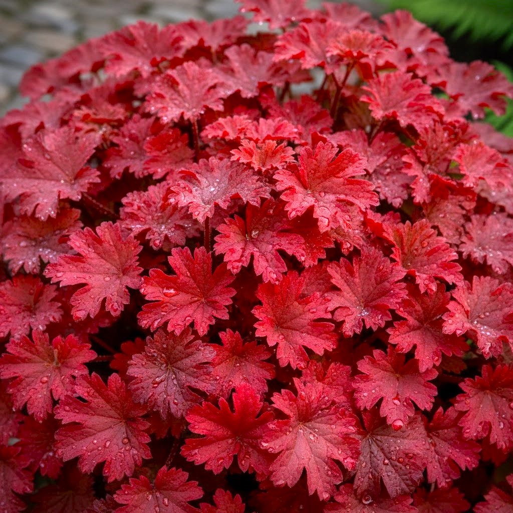 Żurawka Fire Alarm rośnie umiarkowanie silnie, tworząc niezwykle gęstą, zwartą kępę o niemal idealnym, półkolistym kształcie. Liście są średniej wielkości, o lśniącej, grubszą i nieco skórzastej strukturze, która w pełnym słońcu nabiera wyjątkowo nasyconego, czerwonego blasku. Pod spodem liście zachowują równie intensywny kolor, co sprawia, że kępa wygląda spektakularnie z każdej perspektywy. Są one idealne do tworzenia barwnych obwódek, kompozycji w donicach oraz jako mocny akcent kolorystyczny na cienistych rabatach. Pełnię swojego „pożaru barw” prezentują przez cały sezon, od wczesnej wiosny aż do późnej jesieni.