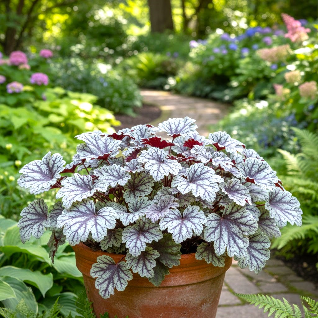 Żurawka 'Rex Silver' to nowoczesna, niezwykle ceniona odmiana z serii Rex, która od lat zachwyca w ogrodach swoją potęgą i elegancją, będąc symbolem wyrafinowanego stylu i księżycowego blasku. Jej liście, o charakterystycznej, metalicznej barwie, wyróżniają się na tle innych roślin niespotykanym, srebrzystym połyskiem z kontrastującym, ciemnym unerwieniem. Jest to roślina niezwykle wytrzymała i mało wymagająca, co czyni ją doskonałym wyborem zarówno dla początkujących ogrodników, jak i projektantów poszukujących bylin o spektakularnym pokroju. Wybierając Rex Silver, zapraszasz do swojego ogrodu niezwykły aromat nowoczesności i gwarancję zdrowych, srebrnych dywanów dla całej rodziny.